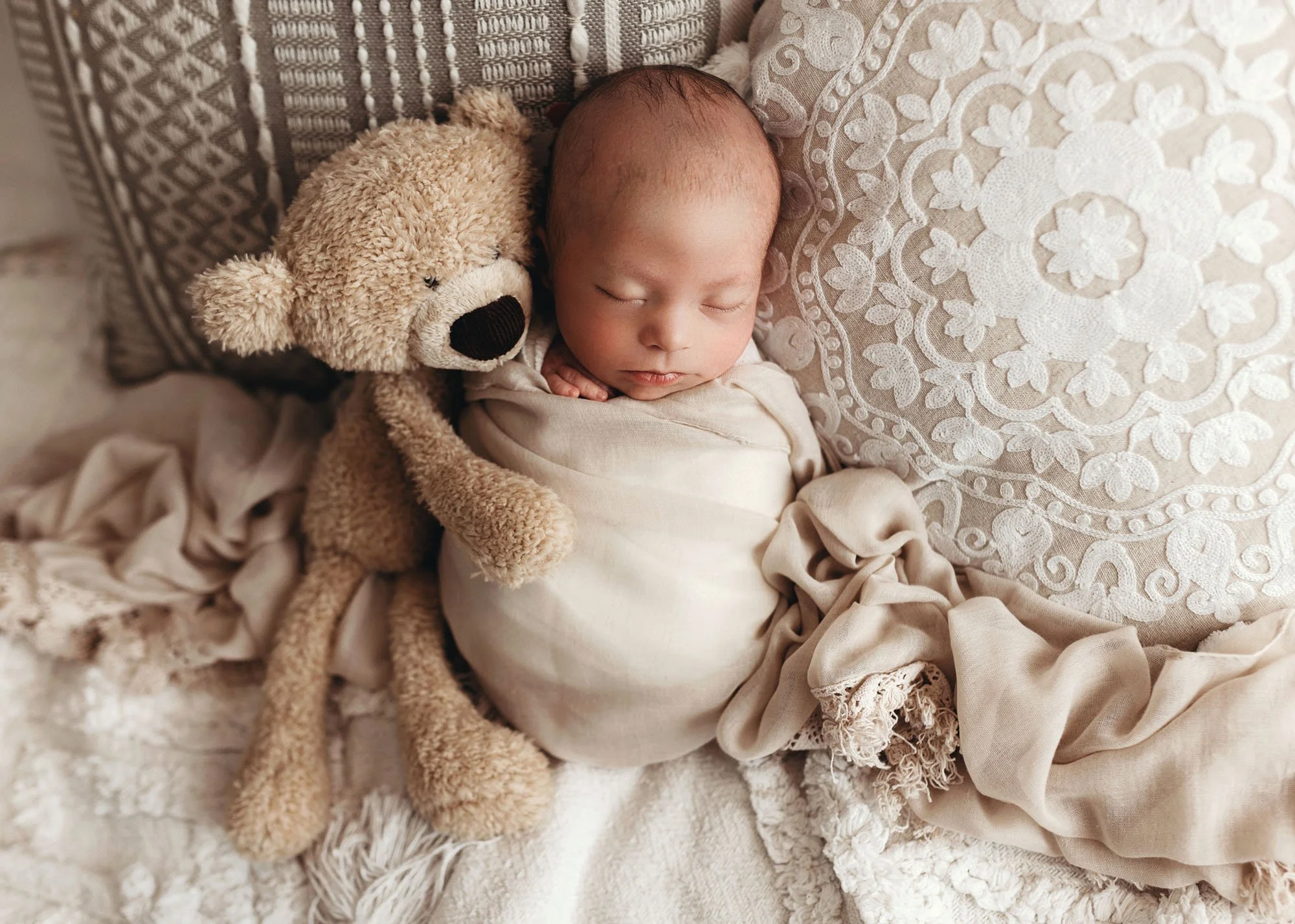 All wraps, blankets, and props are provided in soft, neutral tones to create a timeless, cohesive gallery. Parents and siblings are always welcome. Simple, solid colors photograph beautifully, and if you have a meaningful heirloom or keepsake, I’m happy to incorporate it.